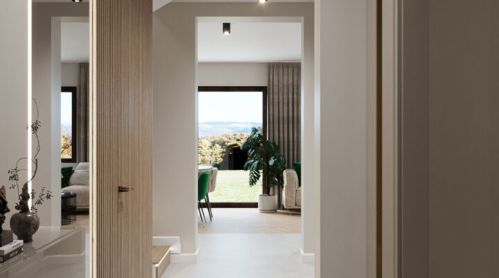 Projekt domu w zieleni i beżu Dom jednorodzinny Ciepły nowoczesny beż, biel, złoto, zieleń, kamień naturalny, drewno, welur