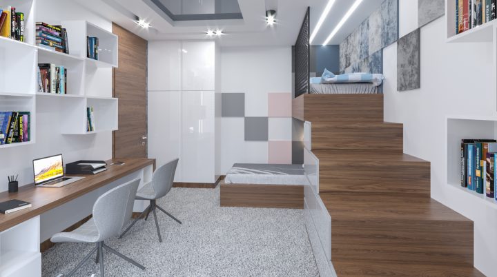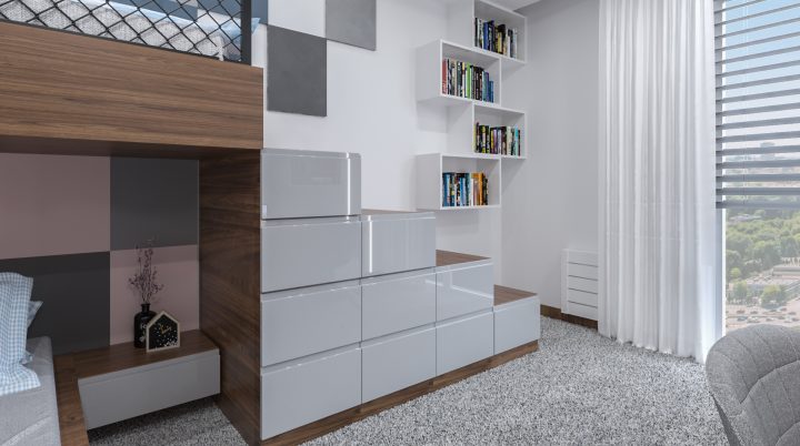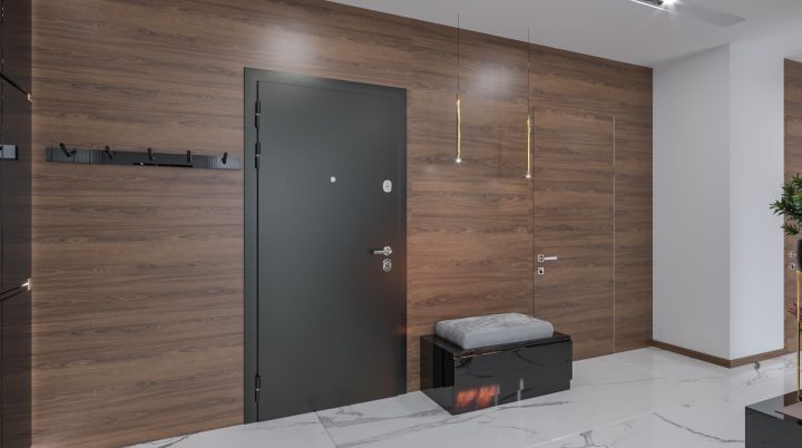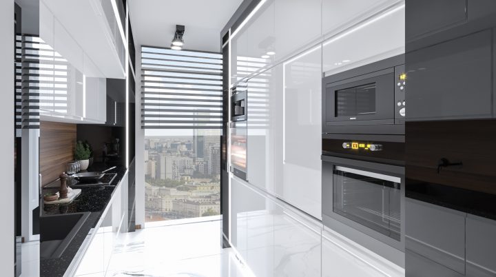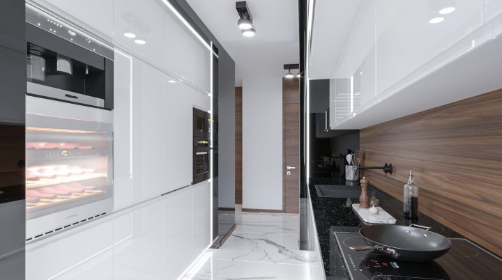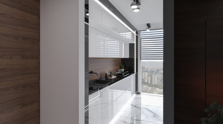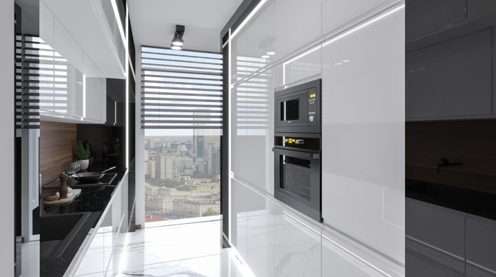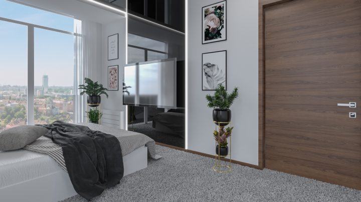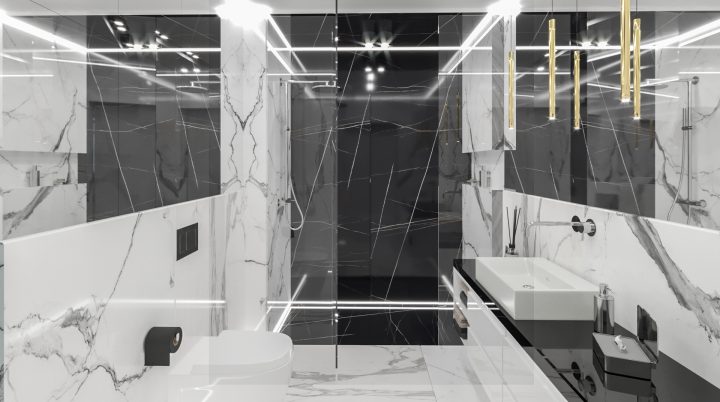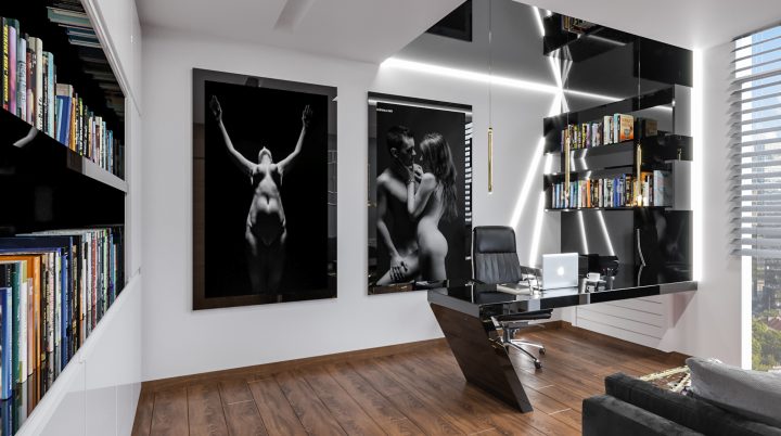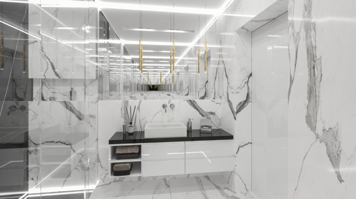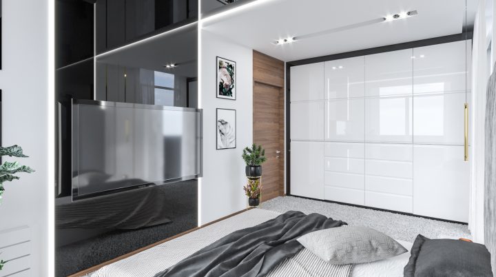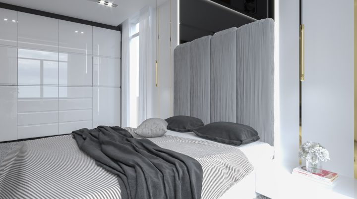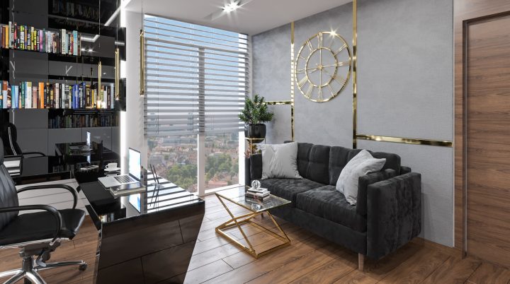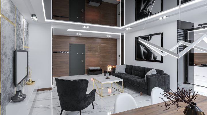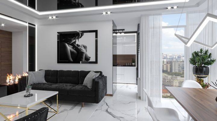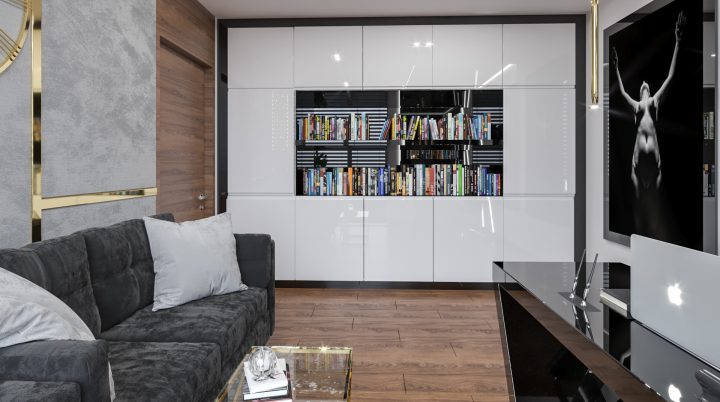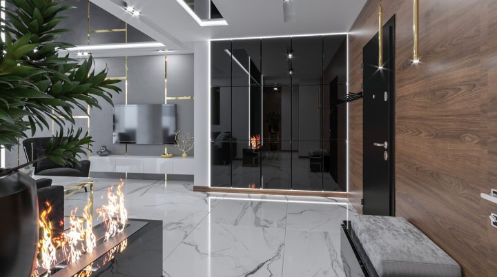 Apartament został wykończony na najwyższym poziomie, na podłodze i w łazienkach zastosowany został naturalny kamień Calacatta a na blacie granit Star Galaxy. Ściana z telewizorem wykończona jest panelami z welury przedzielonymi złotymi listwami wykończonymi na wysoki połysk. Kominek parowy stanowi niezwykłą ozdobę wnętrza, podobnie jak czarny sufit napinany i oświetlenie Led wokół niego. Drewno naturalne orzech amerykański i czarny MDF na wysoki połysk dodają wnętrzu elegancji i klasy.