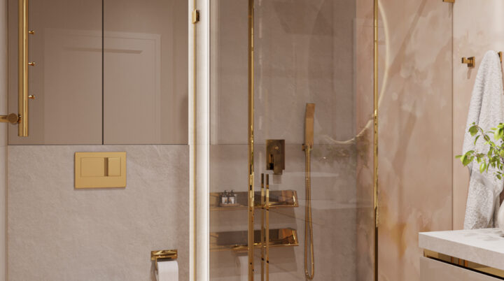 Projekt domu w zieleni i beżu Dom jednorodzinny Ciepły nowoczesny beż, biel, złoto, zieleń, kamień naturalny, drewno, welur